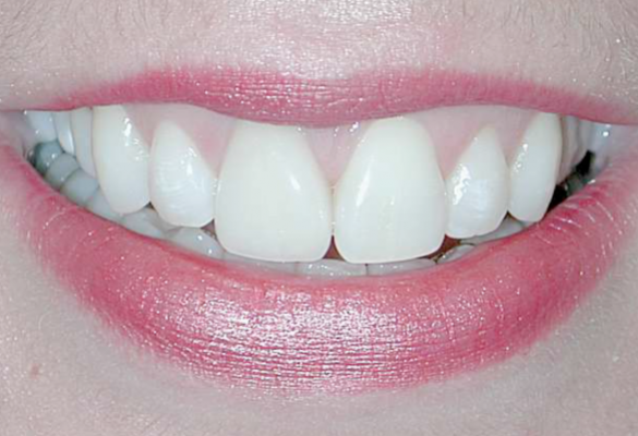 Our patient opted for some teeth whitening, Dental Contouring and composite bonding to reshape the 2 front teeth. This was all done in just 1 session. With Dental Contouring the 2 front teeth were slightly slenderised by safely polishing some of the enamel away on the outer sides to make the teeth look slimmer. In addition the laterals were made slightly wider by adding composite and using a Bonding technique.